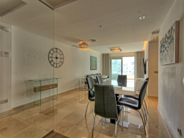 With 145 m² of interior space, the apartment features three generous bedrooms and two bathrooms, designed to capture natural light from its south, southeast, and southwest orientations. Enjoy limited sea views and beautiful sunsets from the spacious terrace.
