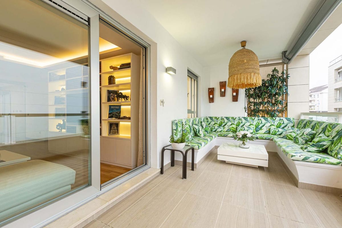 It features a separate kitchen, divided from the living room by a large glass door, and equipped with a laundry room that leads to a spacious patio. The total area is 113 m², providing ample and functional space. The living room opens onto a 19 m² terrace, ideal for enjoying the Costa del Sol's climate. The price of €649,000 includes a garage.
