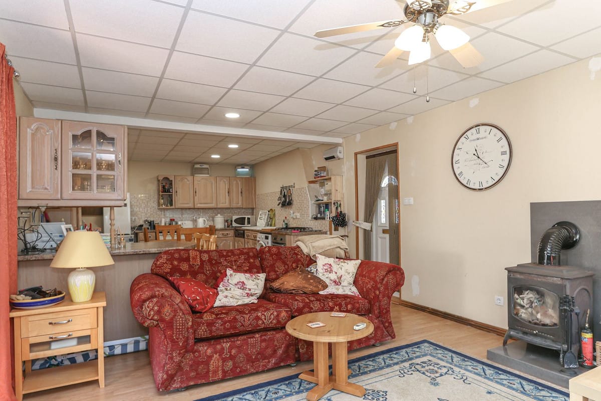Comfortable living area with fireplace, electric radiators, and air conditioning (hot & cold)