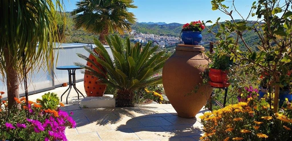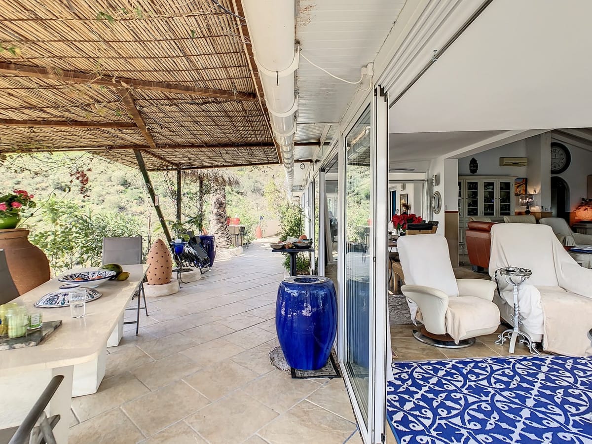 You are looking for a large villa with a heated swimming pool, neatly hidden nearly at the top of a mountain, surrounded by nature with breath-taking views of the valley up to the sea and the village of Arenas? This might just be what you are looking for. At the entry of the property, you find a covered parking space for at least 6 cars and a workshop. From there you step onto a wide porch that surrounds the whole property. In the centre of the house, that ́s all on one level, you find an office, 3 bedrooms, 2 bathrooms (one on-suite), 2 kitchens, an open bbq space, a large sitting/dining room and more sitting areas with views to the outside through French doors. Around the porch there is an array of different privative sitting/sunbathing spaces where it is just a dream to be. Here you also find the heated swimming pool, palm trees, an exterior bedroom and a passage leading to little romantic benches with fantastic views all around the foot of the property. There is also an outdoor kitchen. This property is well finished and comes with all the amenities. It is perfect for people that are fond of comfort and privacy. We are pleased to be able to present this dream property to you soon, either personally or via virtual viewing. Because this world, it is unique – just like our Axarquía. In Andalusia. On the Costa del Sol. Here, on the sunny side of life…