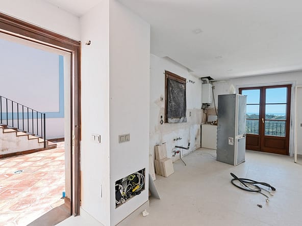 The main living area opens directly onto an expansive terrace, ideal for entertaining or relaxing while enjoying uninterrupted coastal vistas. A private swimming pool enhances the outdoor experience, creating a tranquil retreat for warm Costa del Sol days.