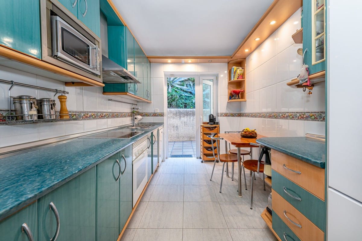 The residence offers 140 sqm of living space on a single level, including an enclosed terrace integrated into the main living area. Facing due South, the property is bathed in natural light. The current layout features 3 bedrooms, 2 bathrooms, and an independent kitchen. Crucially, the property’s structure allows for a complete floor plan reconfiguration, enabling the relocation of the kitchen to create a contemporary open-plan living space facing the Mediterranean.