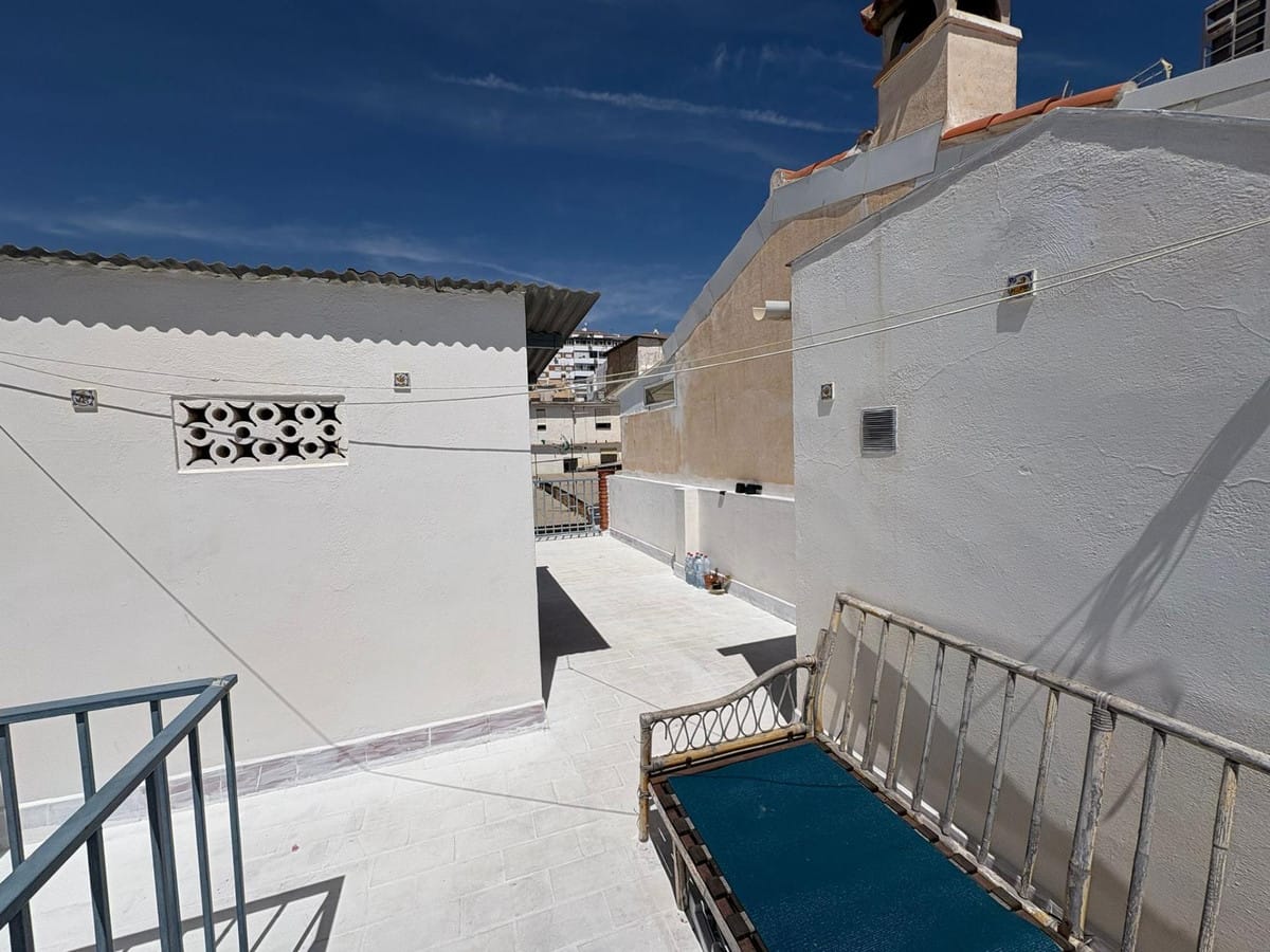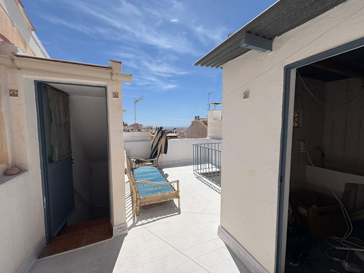 The property is distributed over two floors plus a spacious rooftop terrace. On the ground floor, you'll find one bedroom, a small bathroom, a cozy living room, and a functional kitchen with access to a small patio. The second floor features two bright bedrooms and a full bathroom. The terrace, approximately 45 m2, includes a laundry room and boasts beautiful sea views, making it the perfect space to relax, enjoy outdoor dining, or create a chill-out area.