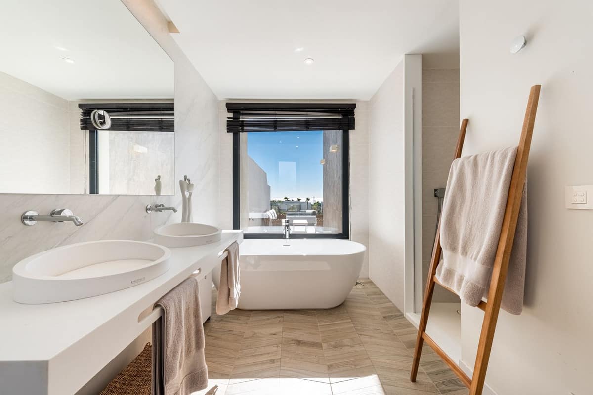The house offers 3 bedrooms, all with en-suite bathrooms, a guest toilet, and a practical storage/laundry room. The open-plan living room and kitchen lead directly out to a wonderful terrace, while the large floor-to-ceiling windows fill the home with natural light and create a sense of space and luxury.