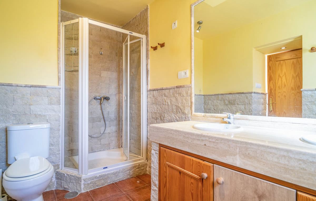The first floor comprises three spacious bedrooms, including a master bedroom with en-suite bathroom and private terrace offering beautiful views of the gardens, pool, and the Mediterranean Sea. The remaining two bedrooms share a well-appointed family bathroom with shower.