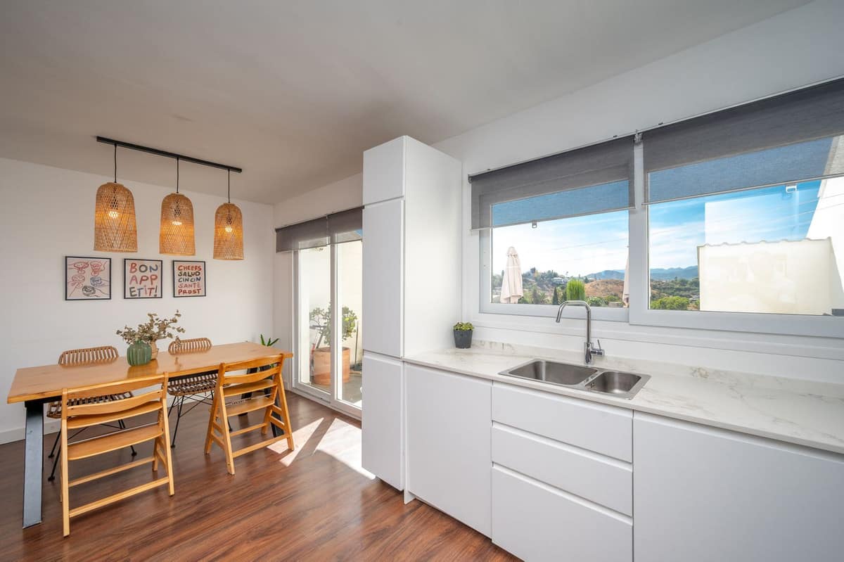 Villa Christine is a spacious south-facing family home set on a generous 900 m² plot in Mijas. The property offers panoramic views of the Mediterranean Sea, the surrounding mountains, and beautifully maintained gardens. Inside, the grand hallway and marble staircase set the tone for this elegant residence. The modern kitchen features sleek black-and-white finishes, an island unit, and a bay window with stunning sea views.