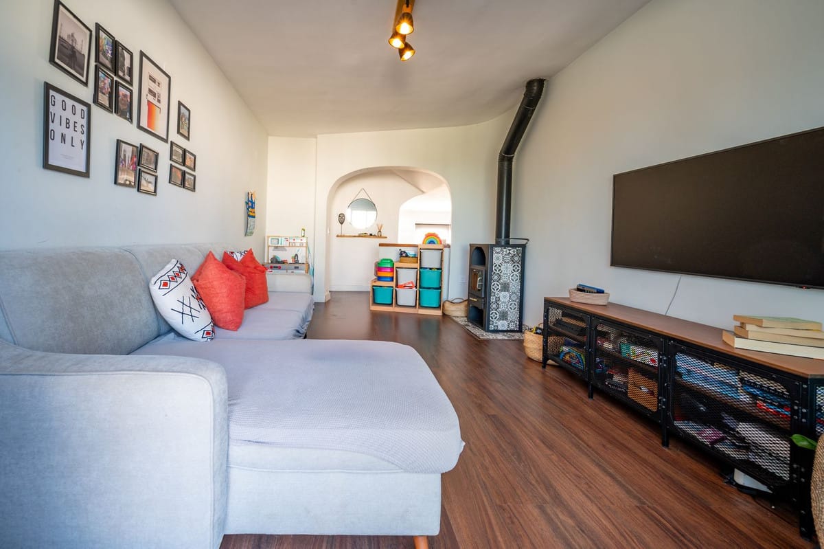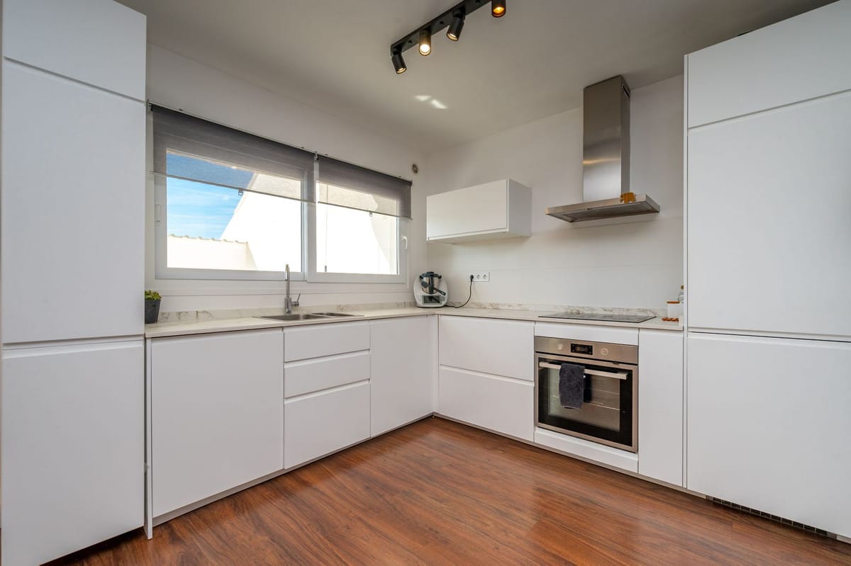 The bright living and dining areas flow seamlessly together, creating a relaxed atmosphere with large windows that fill the space with natural light. The living room includes an open fireplace and marble floors, offering comfort and style in equal measure. Upstairs are three double bedrooms, including a serene main suite with private terrace and sea views. Each room is thoughtfully designed with calming tones and quality finishes.