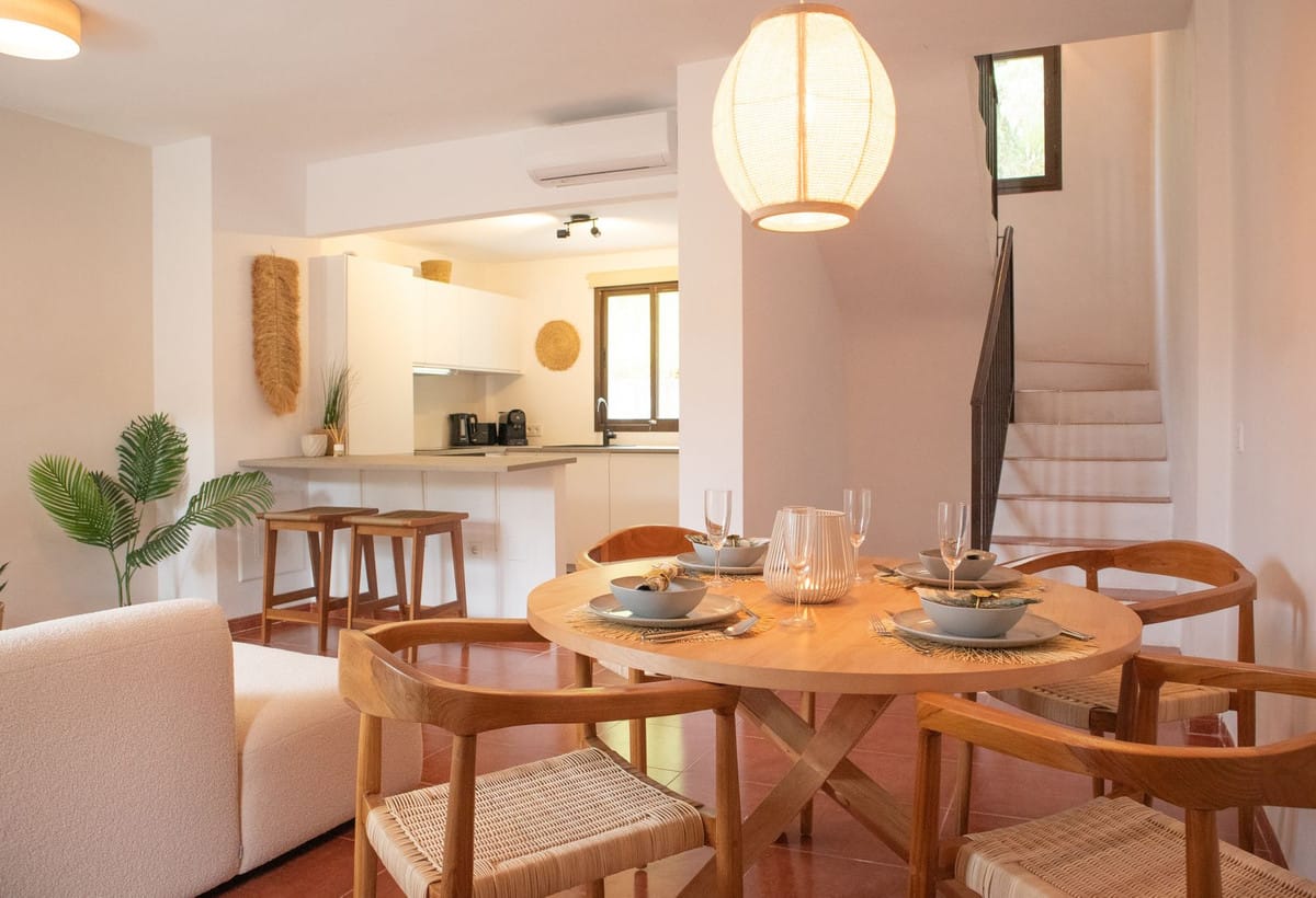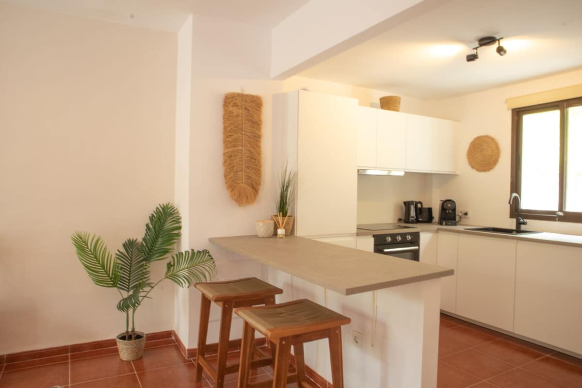 The property is accessed via an attractive Andalucian style porch with beautiful tiles and potted plants that opens up into the entrance hall with large cupboards. To the left is the fully fitted kitchen with separate utility room and guest bathroom. Down a few steps takes you into the large sitting room come dining room with a handy bar for those who like to entertain, and this leads straight out to the large terrace with beautiful Andalucian tiling and colourful plants. There is enough space on this terrace for family dining and a chill out area. A gate at the end of the terrace takes you to the communal gardens and swimming pool with direct access to the beach.