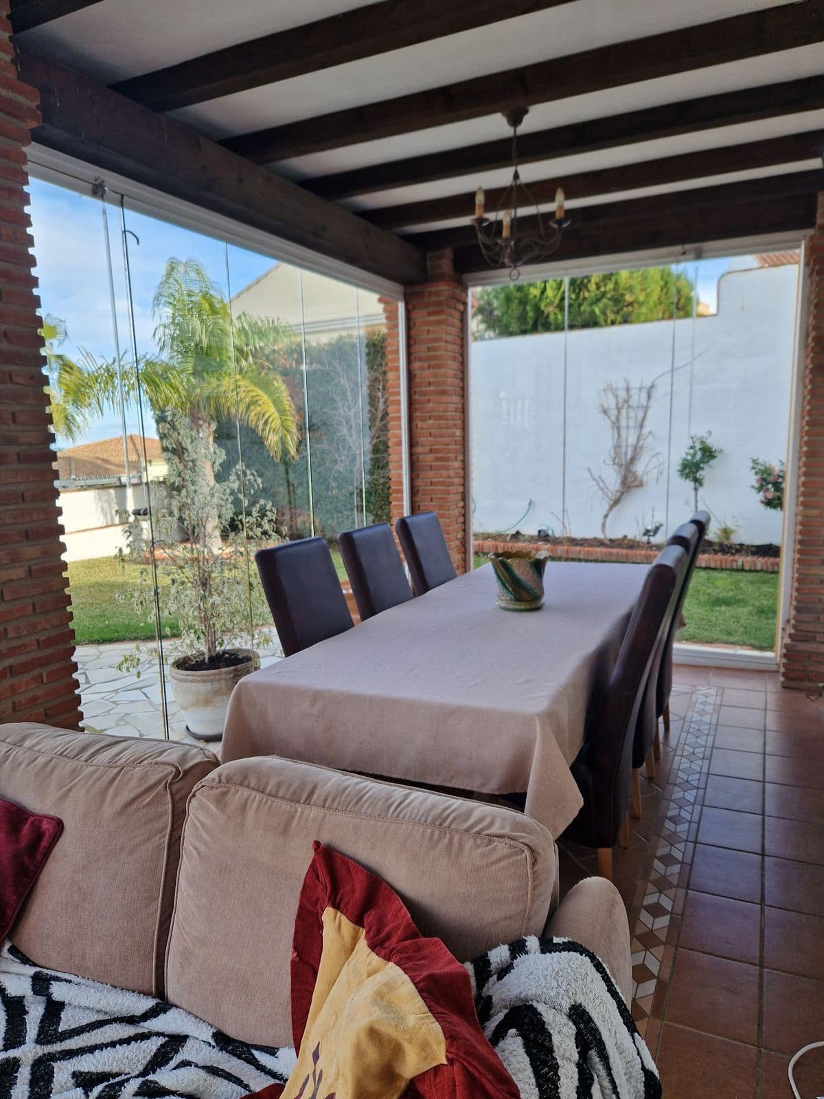 The home benefits from secure parking for two cars within the plot, an alarm system and security roller shutters on the main openings, offering peace of mind whether used as a permanent residence or lock‑up‑and‑leave holiday home. The urbanisation itself is gated with barriers controlling access in the evenings and benefits from 24‑hour security patrols.