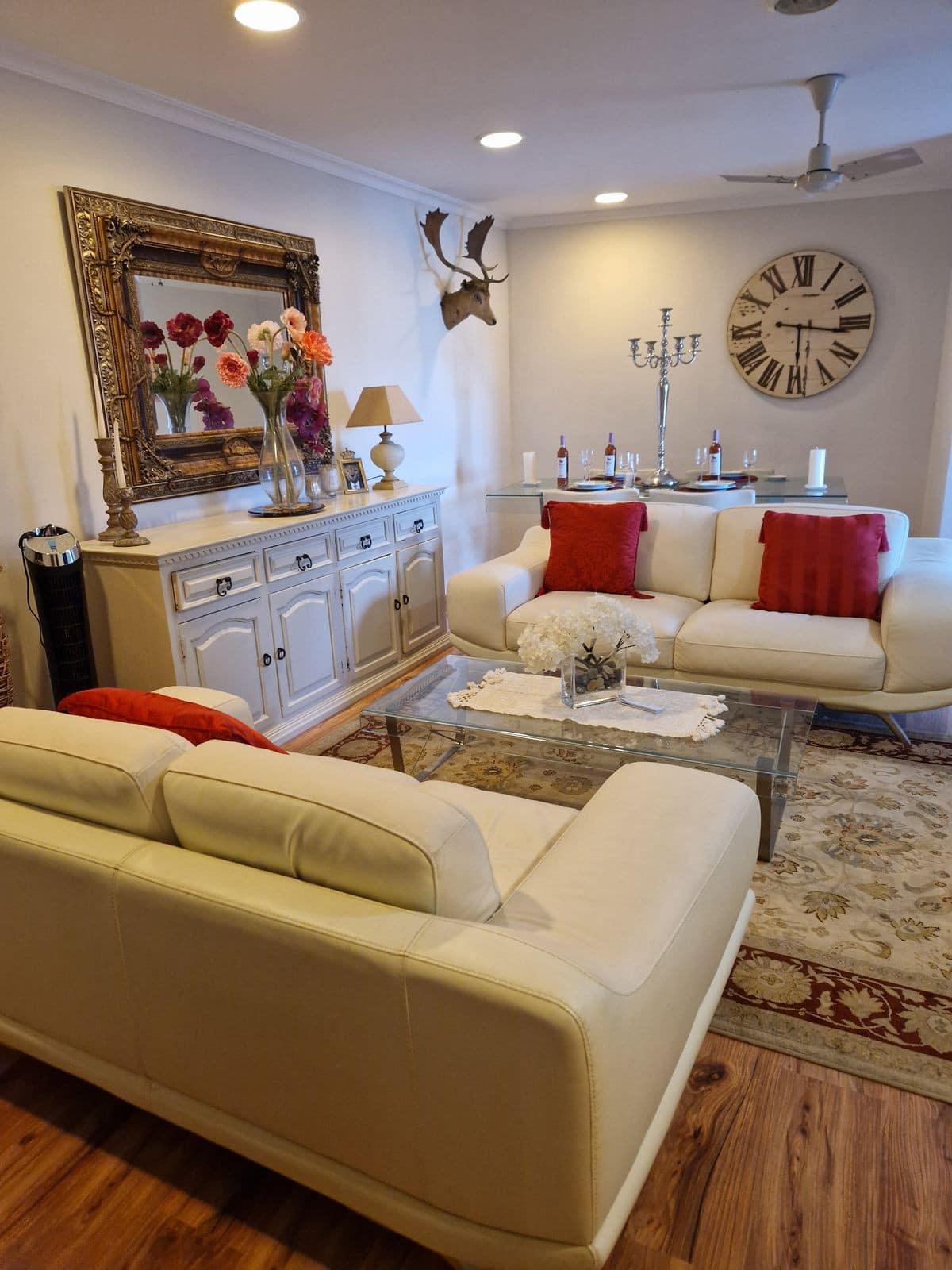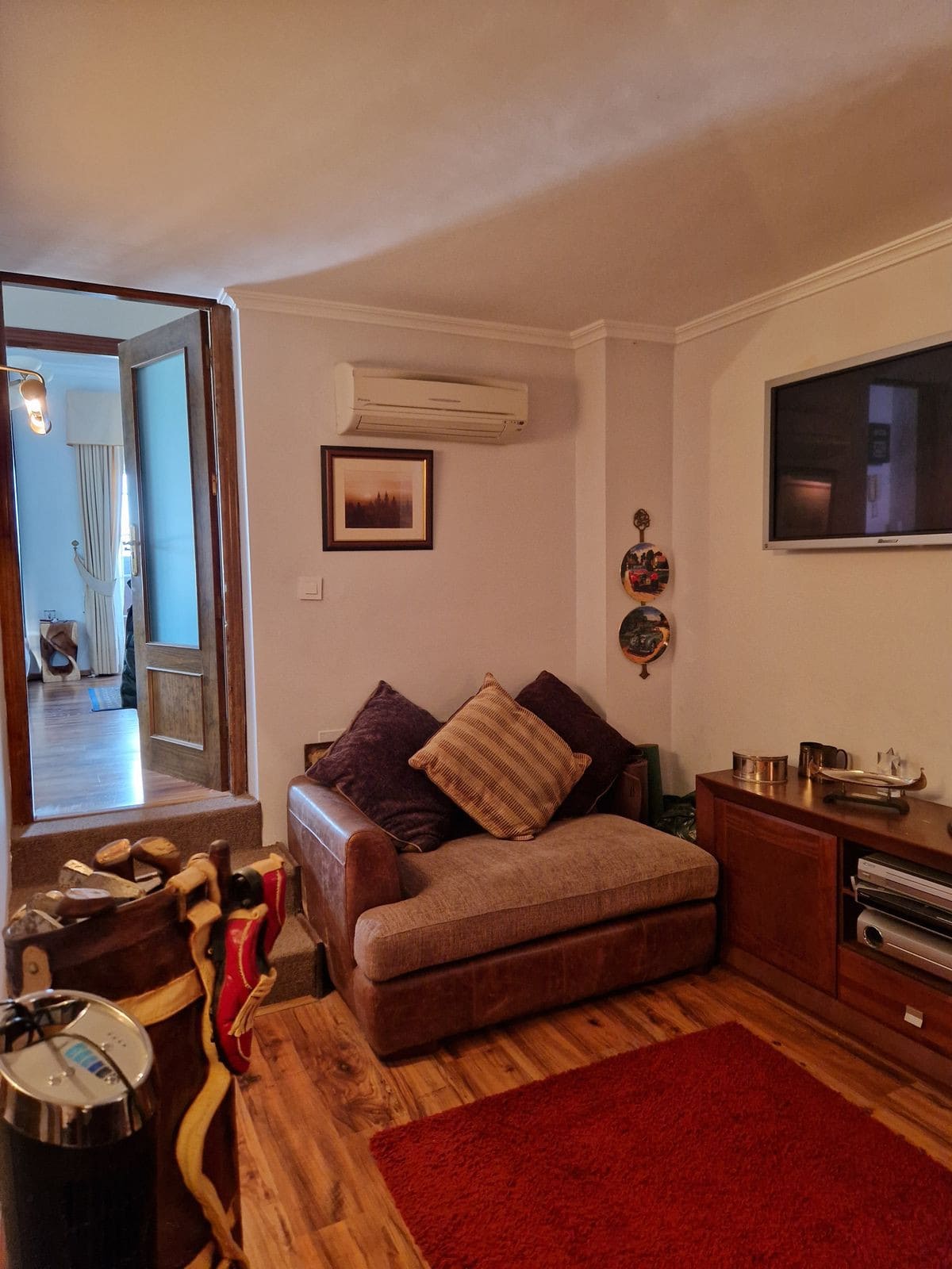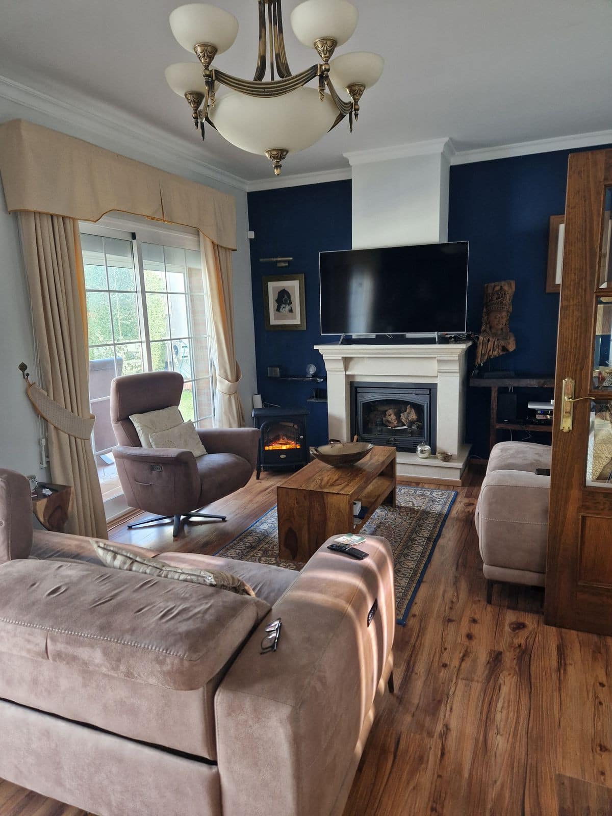 On the main floor, a warm and inviting lounge combines classic details with contemporary comfort, ecessed lighting and a cosy log‑burning fireplace for the cooler months. Expansive glass‑enclosed terraces act as an extra living and dining room, and air‑conditioning in all rooms ensures year‑round comfort throughout the house.