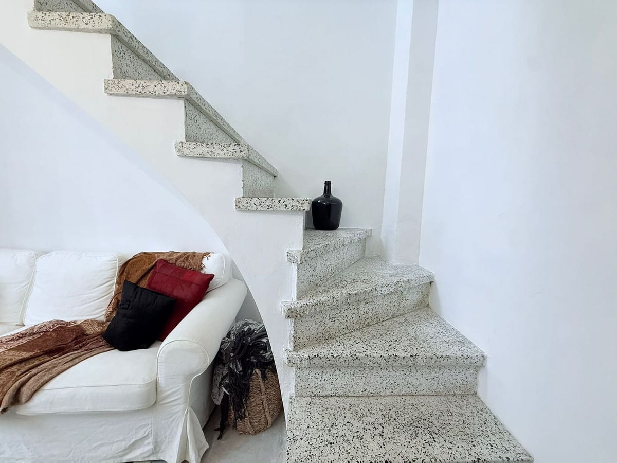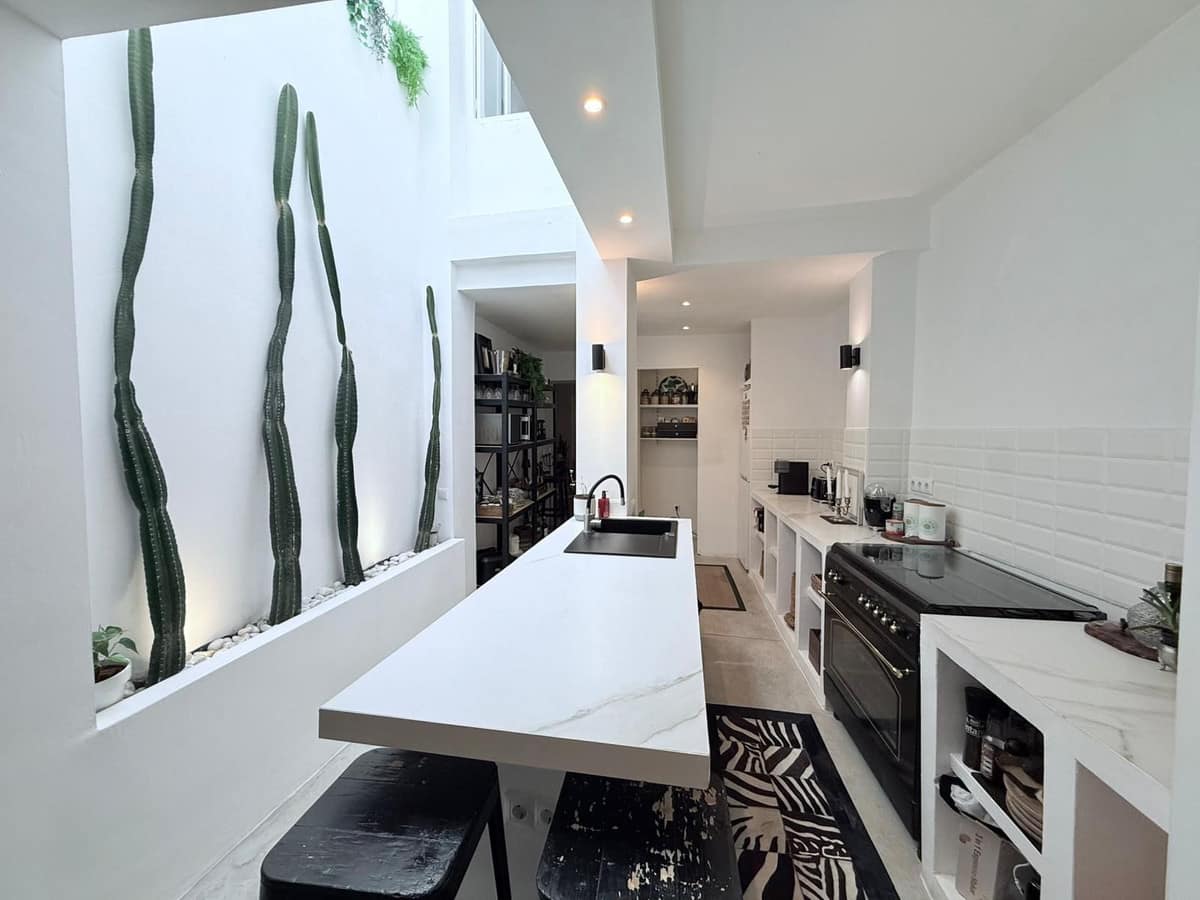 Arranged over three light-filled floors, the home features a spacious open-plan lounge and dining area, flowing seamlessly into a striking fully equipped open-plan kitchen with a range-style oven and central island. A dramatic bespoke light feature runs through the centre of the house, flooding the interiors with natural light and enhancing the airy, elegant, riad-like feel. Beyond the kitchen is an additional lounge area, ideal for entertaining or quiet relaxation. Two separate staircases add both character and flexibility to the layout.