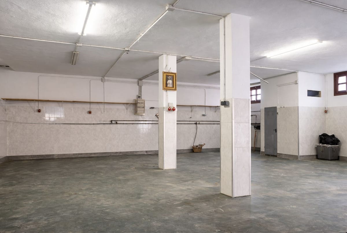 Large space with a guest toilet, currently used as a garage, with capacity for several vehicles and a large storage area.