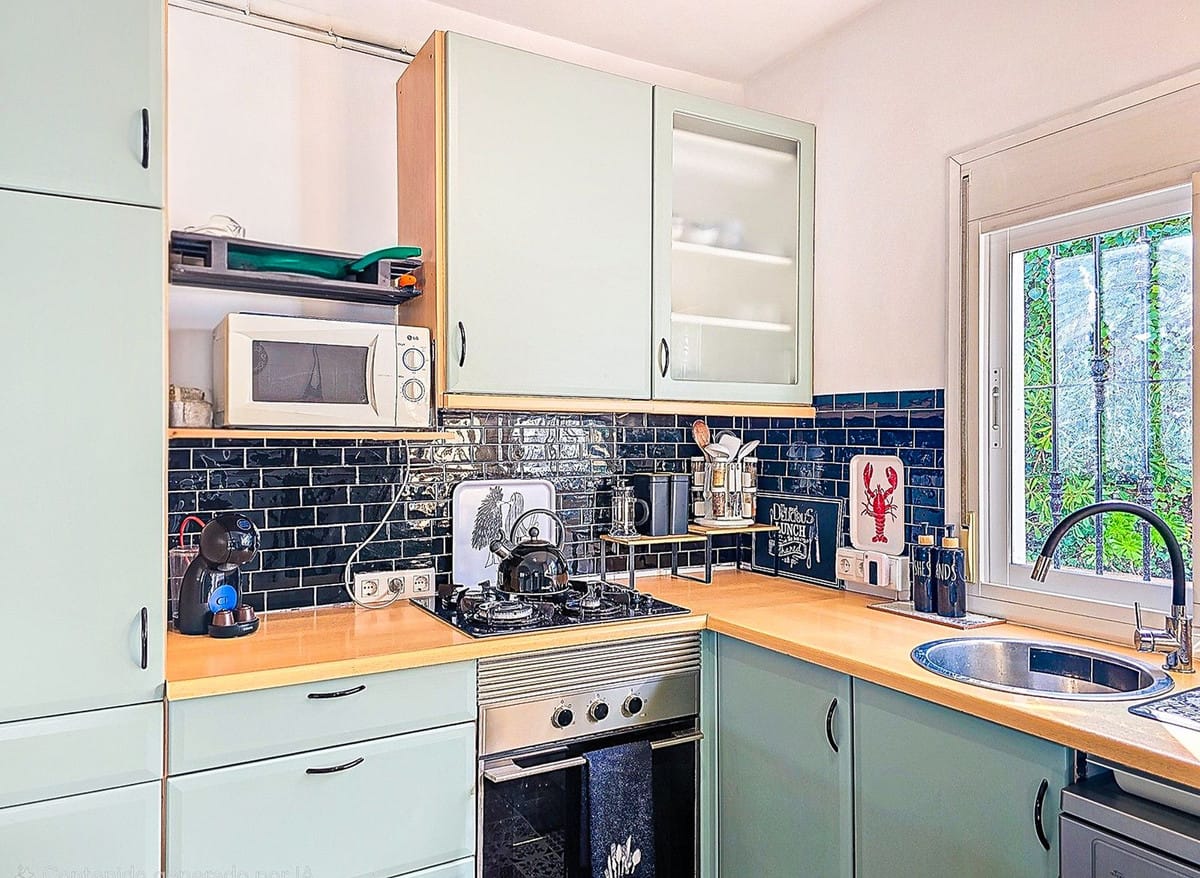 The kitchen is fully equipped, including space saving sliding drawer/pantry unit and integral