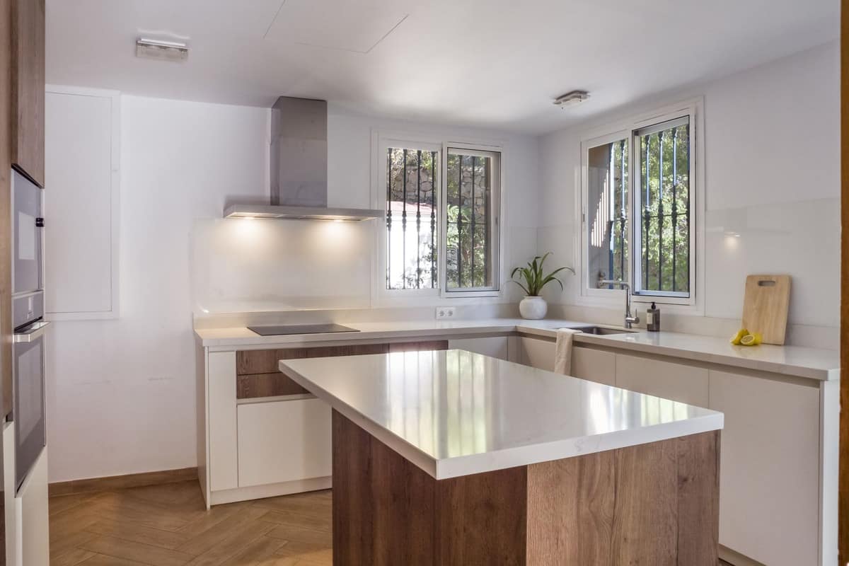 The main level features a welcoming living room with a striking double-height beamed ceiling, fireplace and direct access to a bright south-facing terrace. A separate dining room, cosy TV room, guest toilet and an enclosed terrace—perfect for year-round use—enhance the functionality of the home. The fully renovated kitchen, along with the recently updated ground floor, brings a fresh contemporary touch to the property.