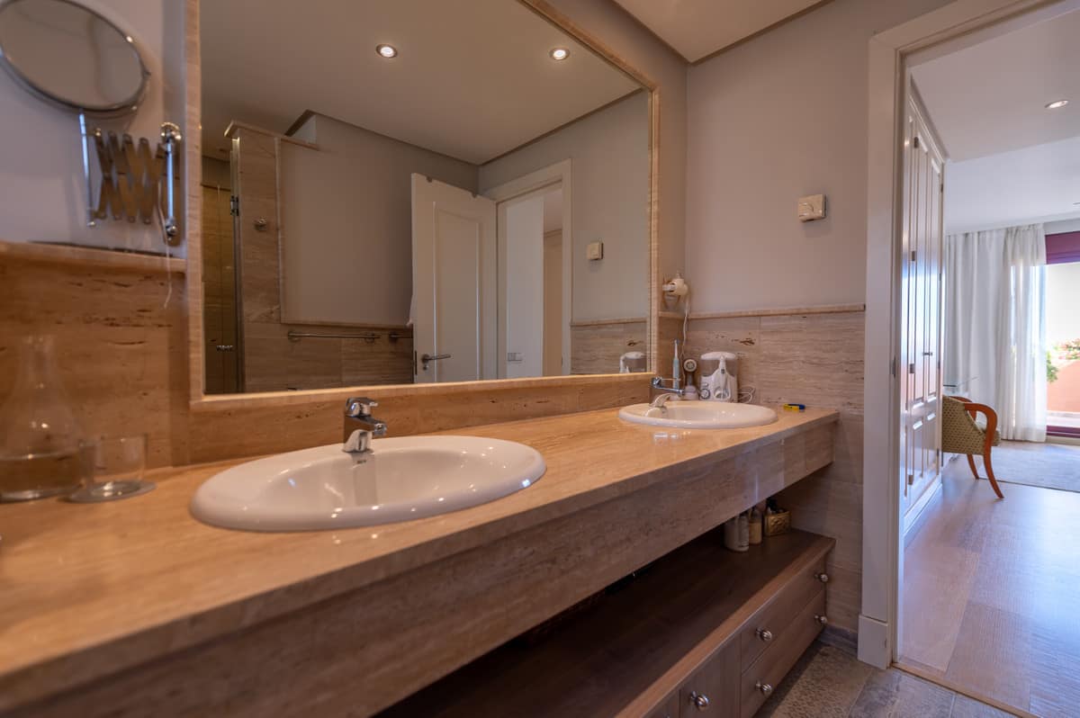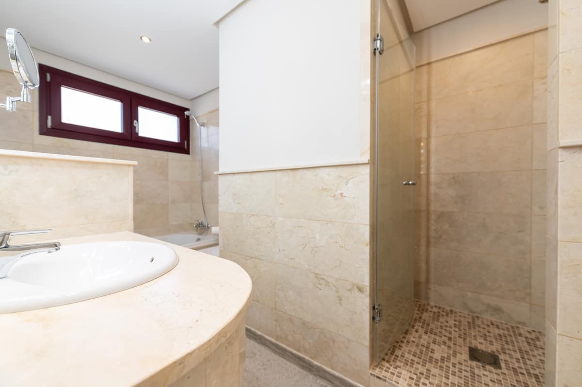 Upstairs the three double bedrooms are very spacious. The master bedroom has an ensuite shower room and its own terrace overlooking the garden and community pool. The other two bedrooms share a family bathroom. All the bedrooms have plenty of storage space and are beautifully bright and light.