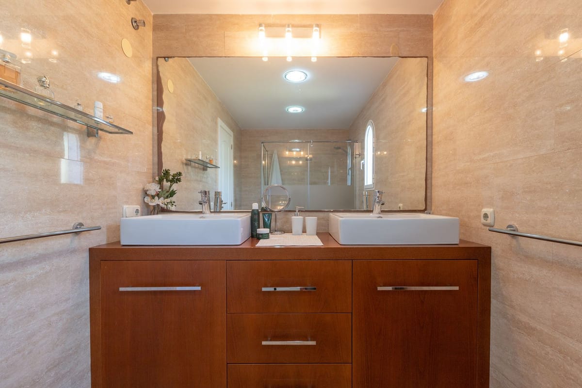 On the upper floor is the sleeping area, divided into three bedrooms. The main bedroom includes an en-suite bathroom and a dressing room, while the other two bedrooms share an additional bathroom. From this level, you access the top floor, where an attic-style room provides the ideal space for a small living room, playroom or multipurpose area. This room leads to the rooftop terrace, which offers unique sea views.
