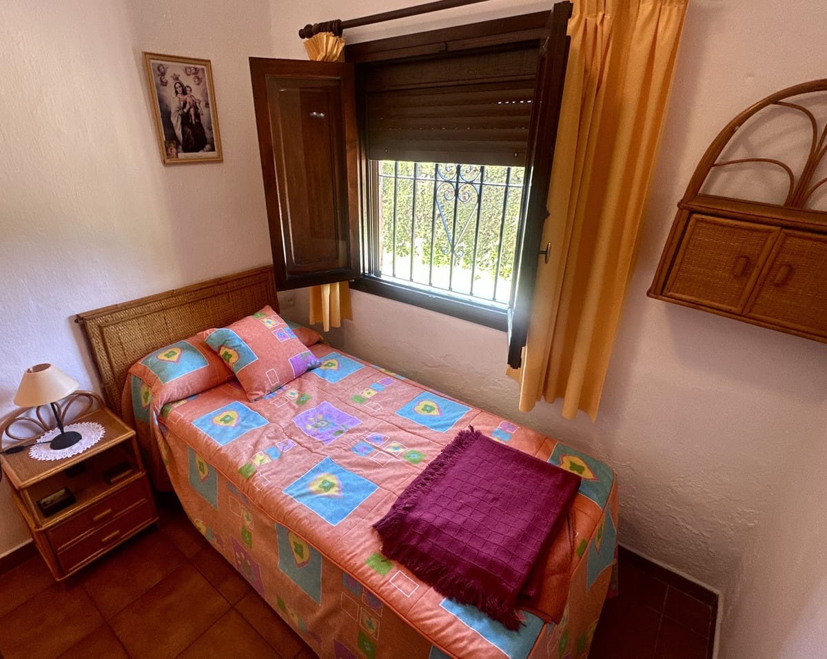 The home is distributed over two floors. Upstairs, you’ll find three bright bedrooms, one of them featuring an en-suite bathroom. The ground floor offers a cozy living room that opens onto a spacious terrace with direct access to the beautifully maintained gardens and the communal swimming pool — ideal for relaxing or spending time with family.