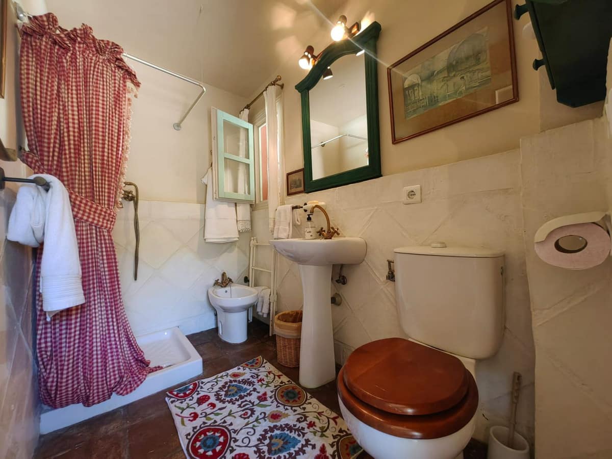 The main residence includes a spacious living room with a traditional Andalusian fireplace, a handcrafted open-plan kitchen with solid wood cabinets and brand-new top-quality appliances, two bedrooms with en-suite bathrooms, and a guest toilet. Both the living room and kitchen open onto a large sunny terrace and a fully renovated private pool, surrounded by lush gardens with an automatic irrigation system and new outdoor lighting.
