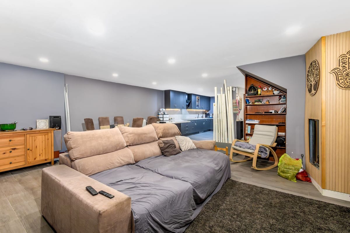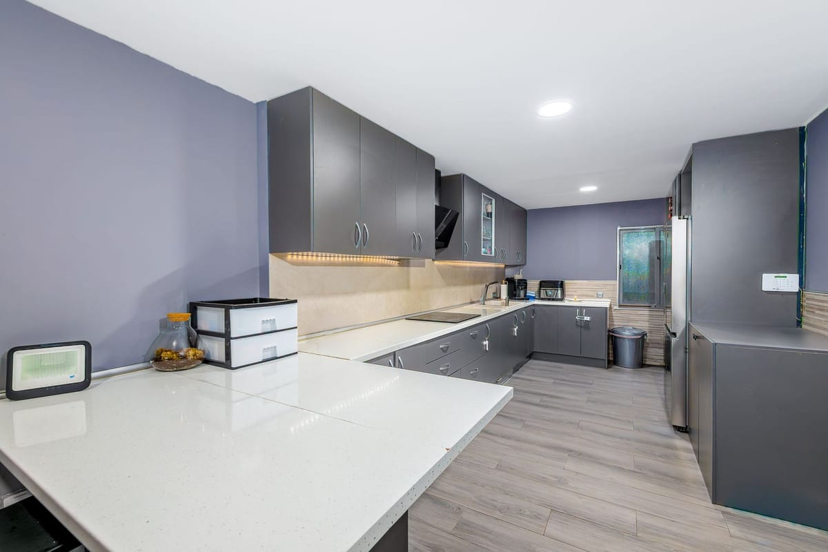 The bright and spacious open-plan living and dining area flows seamlessly into the refurbished kitchen, creating a contemporary and welcoming atmosphere — ideal for family living or entertaining guests.