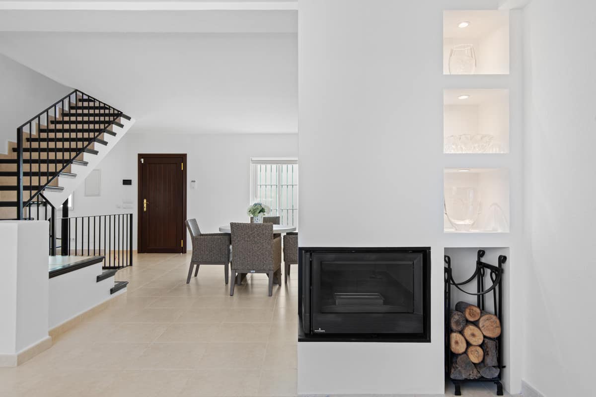 The property combines modern living with charming traditional touches to create a comfortable and welcoming home. A private courtyard patio greets you as you enter through the gate. On the ground floor, there is a spacious living and dining area filled with natural light, along with a fully modernised urban-chic kitchen. From here, you can step out onto a covered terrace with incredible views over the golf course — a lovely spot for outdoor dining or relaxing.