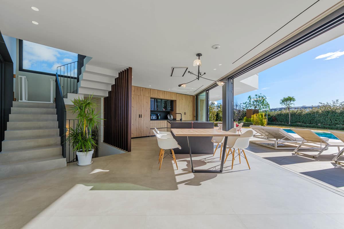 The property is arranged over four perfectly integrated levels, combining spacious and bright areas with a constant connection to the surroundings. The main floor features an elegant open-plan space that integrates the living room, dining area, and designer kitchen with a central island, complemented by large windows that visually expand the home. This level also includes the entrance hall, a guest toilet, and a closed garage for two vehicles. The villa also offers a private pool and a garden with automatic irrigation. The pool area, surrounded by a large covered porch and a paved solarium, creates the perfect setting for relaxation and outdoor gatherings.