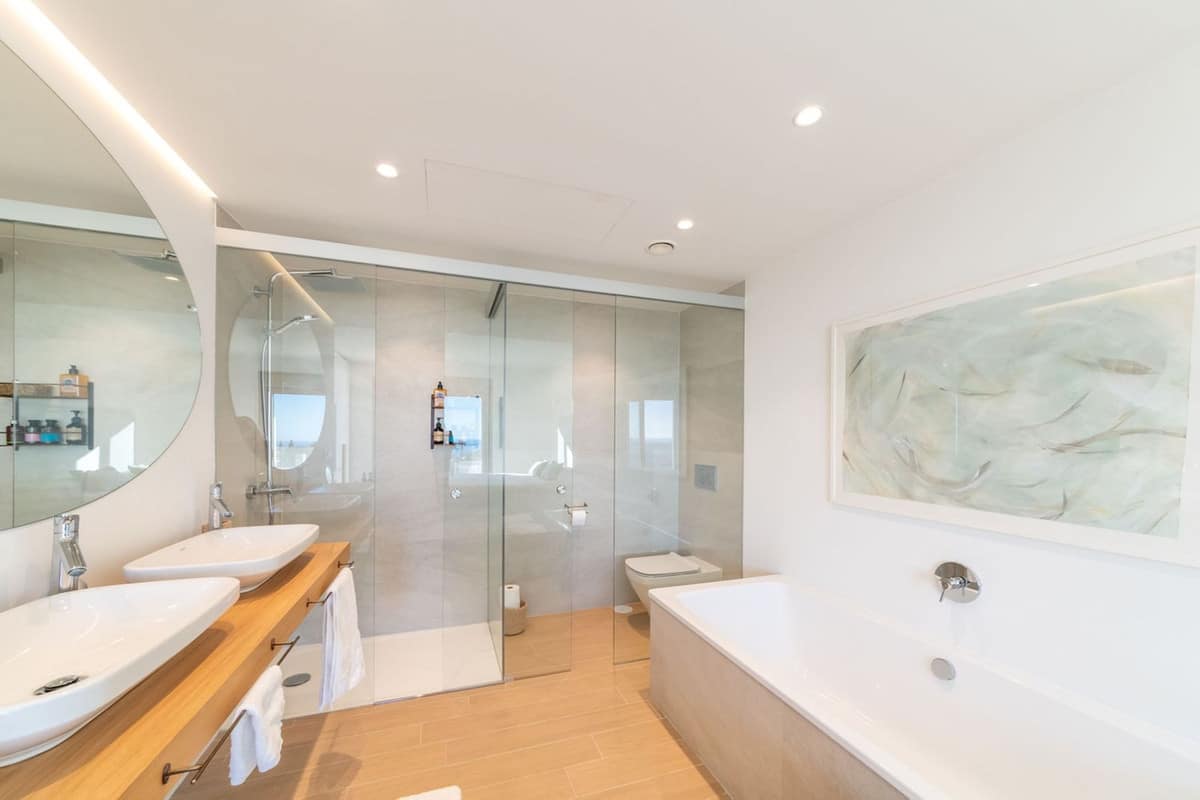 Upstairs, you'll find three bedrooms, including a master suite with a private bathroom featuring a shower and bathtub. The other two bedrooms share an additional full bathroom. Two of the bedrooms have access to another large terrace, perfect for soaking up the sun and enjoying the views.