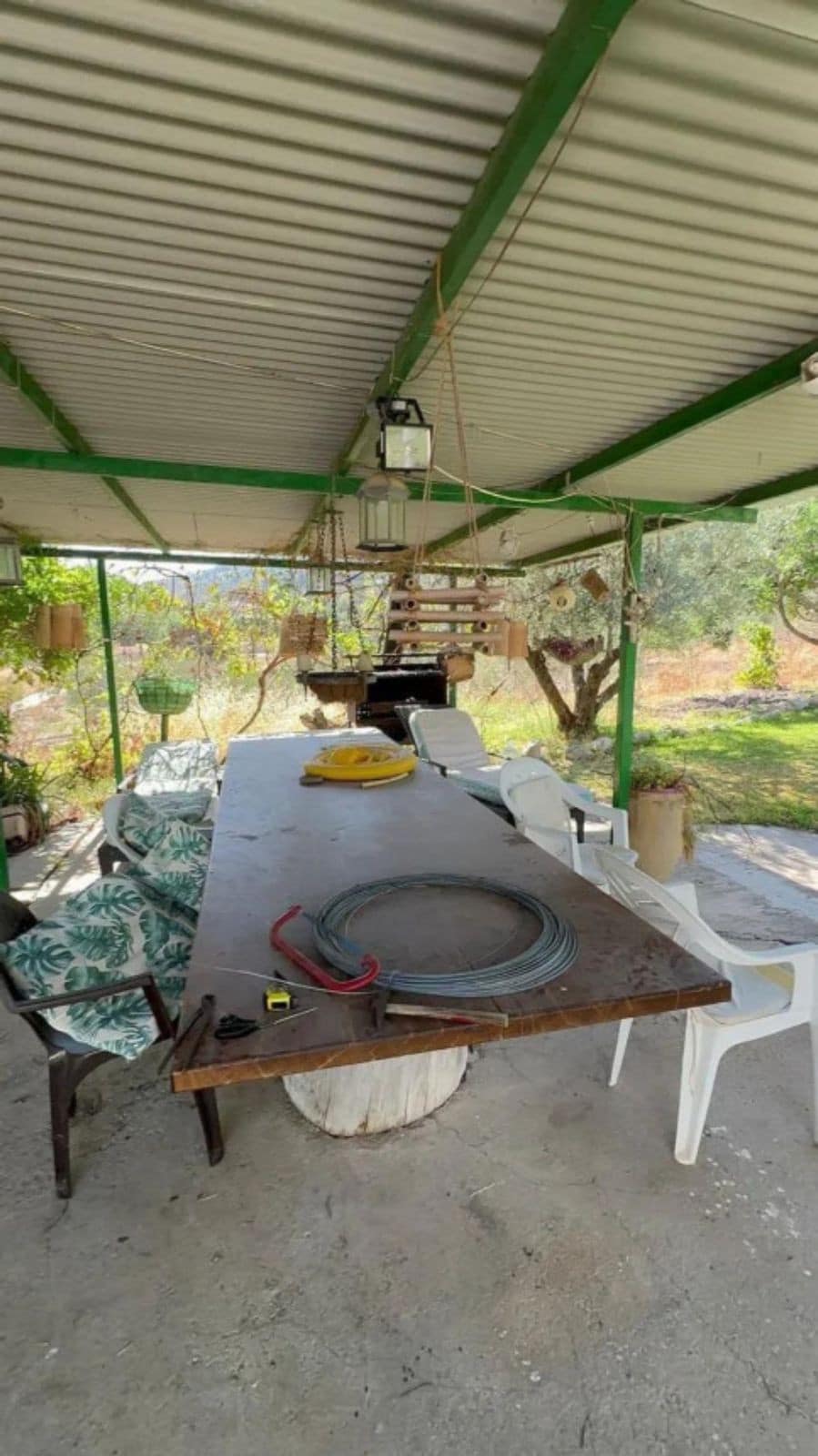 Outdoor living is at the heart of this property, with a spacious patio and barbecue area perfect for entertaining in any season. A private pool with breathtaking mountain views provides the ideal spot to relax and unwind. At the back of the house, an orchard with a variety of mature fruit trees, a chicken run, and a small storage room add to the property’s charm and practicality. An external staircase leads up to a roof solarium, occupying half the house, where you can enjoy panoramic views of the surrounding countryside.