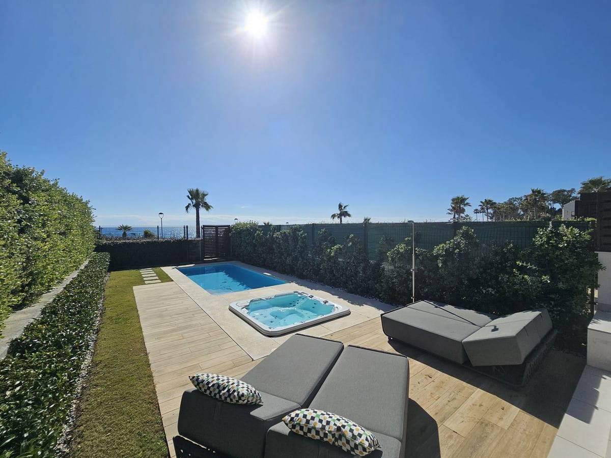 Discover this stunning 3-bedroom, 3-bathroom detached villa that offers a perfect blend of luxury and comfort. Located on just a short stroll from the beach, this property is an ideal retreat for those seeking a seaside lifestyle. The spacious lounge welcomes you with abundant natural light, while the modern fully fitted kitchen is perfect for culinary enthusiasts. The ground floor features an en-suite bedroom, making it suitable for individuals with mobility issues. On the 1st floor, the master bedroom boasts a large en-suite bathroom, complete with both a bath and a walk-in shower, and opens onto a south-facing terrace where you can soak up the sun. A second guest bedroom on the first floor also includes an en-suite bathroom with a walk-in shower. Step outside to enjoy your private pool, which has pre-installation for heating, ensuring year-round enjoyment. The garden and pool area bask in sunlight for most of the day, creating an inviting outdoor space. The local village of Cancelada is just a 10 minute walk over the foot bridge, with a variety of bars, restaurants, banks and supermarkets. With off-road parking available and located on the beach side of the New Golden Mile, this villa is perfectly positioned between Estepona and San Pedro, making it convenient for all your needs.