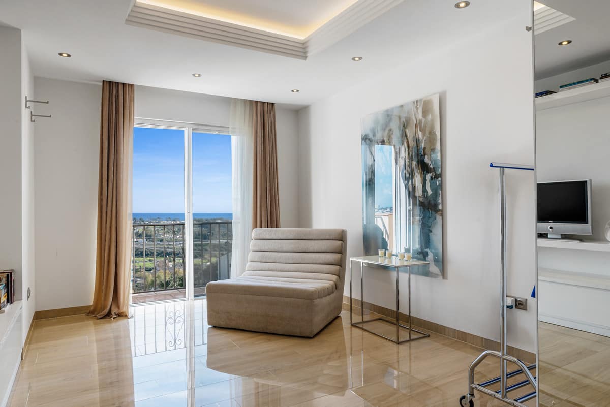 Multiple terraces, including a large covered main terrace, create exceptional indoor-outdoor living, ideal for both relaxation and entertaining while enjoying the stunning views. The upper level is dedicated to the impressive master suite, featuring his-and-hers bathrooms, a large dressing area, and direct access to a private terrace. An additional en suite guest bedroom completes this floor.