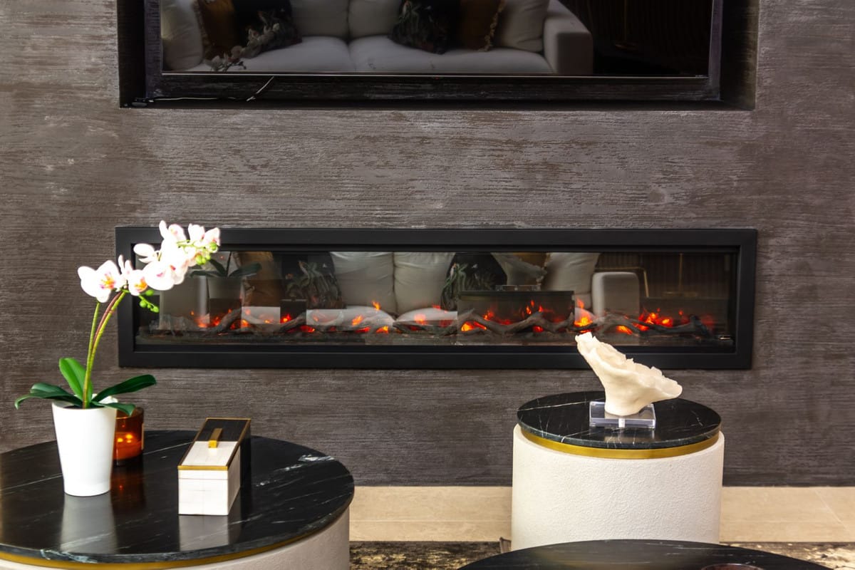Living Room: Expansive and light-filled with floor-to-ceiling glass doors opening onto the terrace. Generous lounge and dining areas designed for refined entertaining and relaxed living. Place built furniture and gas fireplace.