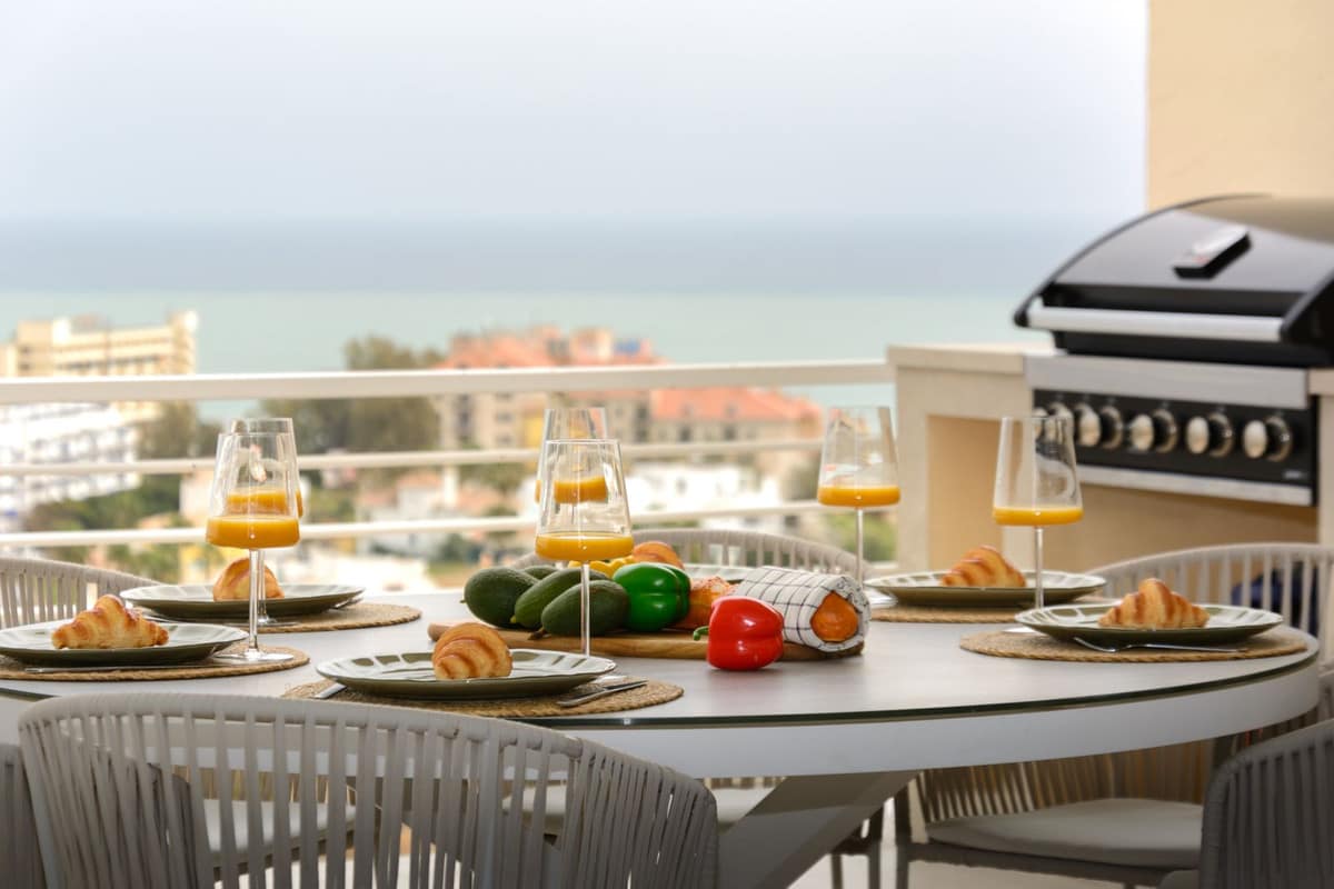 The spectacular outdoor area is a true highlight — featuring a lovely lounge area, a dining area and an outdoor kitchen with a barbeque. The terrace is completely private, nobody can see you here, but at the same time you have wonderful views to the sea, all of Benalmadena and all the way to Sierra Nevada.