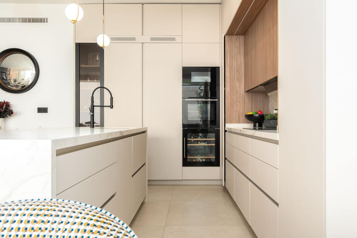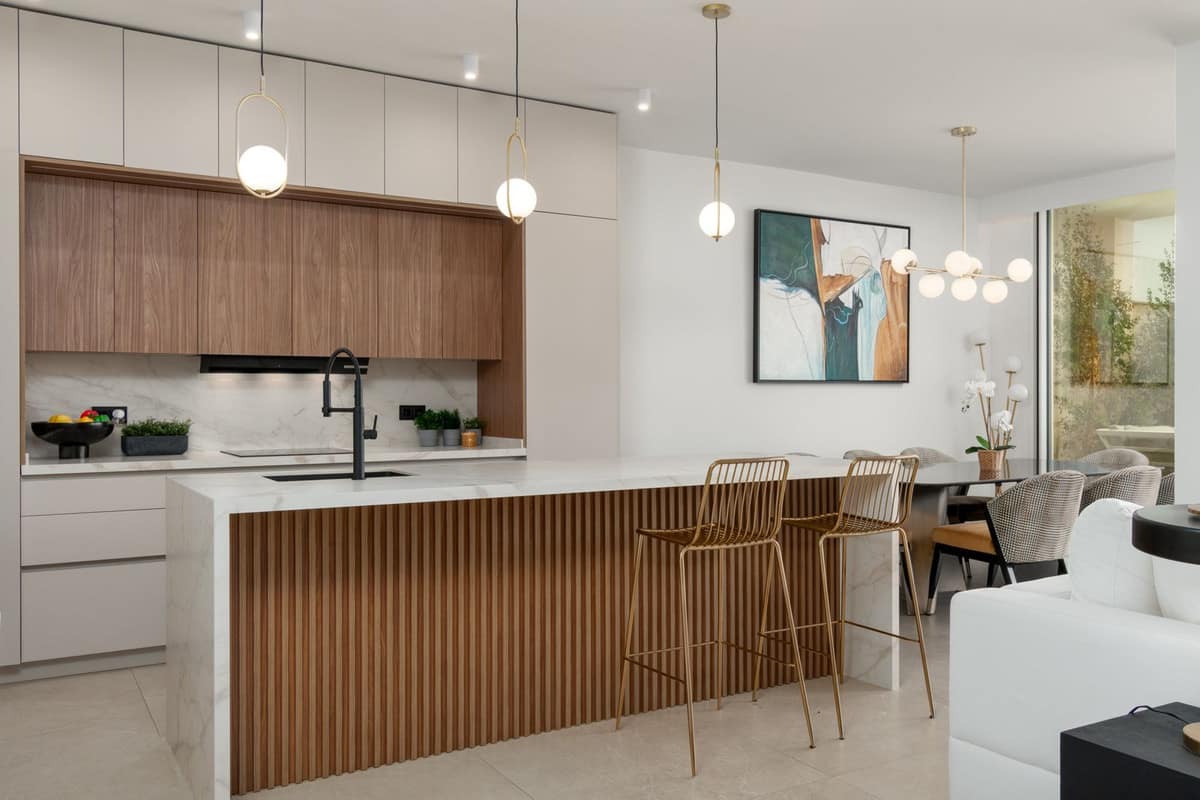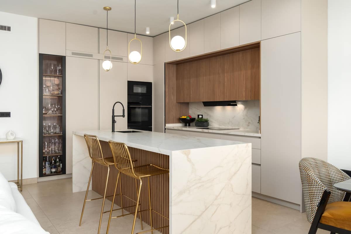 Kitchen: Bespoke open-plan kitchen of superior quality, fully equipped with premium appliances including fridge/freezer, oven, microwave, dishwasher and wine cooler. Bedroom 1: Spacious double bedroom with fitted wardrobes, 2 working spaces and and natural light. Opening up to a large terrace with mountain and pool view. Bathroom: Stylish bathroom with walk-in shower, vanity, wc and storage. Second floor: Bedroom 2 & 3: Spacious bedrooms with fitted wardrobes and natural light. Direct access to a large terrace with sea views.