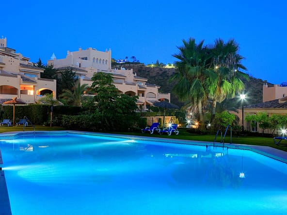 The apartment features an impressive wrap-around terrace with direct access to the beautifully maintained communal gardens and swimming pools. The outdoor space is ideal for relaxing, entertaining, and enjoying the Mediterranean lifestyle, including a picturesque terrace with a private hot tub overlooking the lush surroundings.