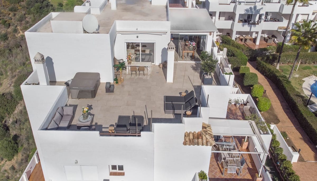 An immaculate and rarely available 4-bedroom apartment located in the prestigious Mirador de Estepona Hills. This spacious home offers four generous bedrooms with fitted wardrobes and three modern bathrooms (one en suite). The state-of-the-art fully fitted kitchen includes a separate utility room.