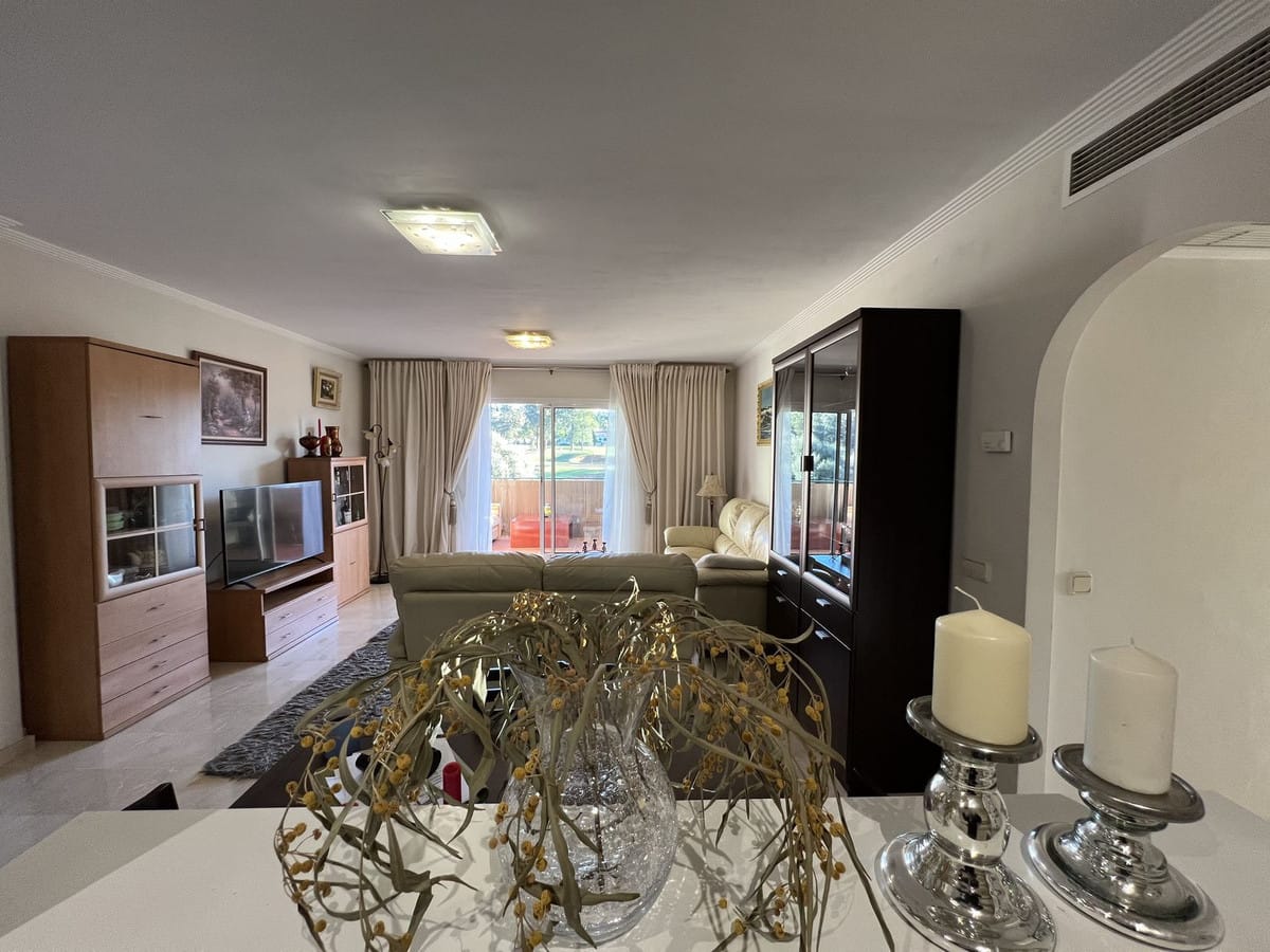 This well positioned 4 bedroom 3 bathroom first floor apartment is spacious, bright and situated in an ideal location. Close to schools, beaches and convenient shops and restaurants. Hacienda del Golf is a community driven urbanisation. With families and long term residence making it a complex that is alive all year round. Known for its excellent facilities with a well cared for community. Secure and well presented, this apartment also has the convenience for a private underground parking and a corner storage unit that gives extra space. The first floor apartment, reachable also by lift is well presented, with a fully fitted semi open plan kitchen onto the lounge and dining room. The terraces are very impressive and wrap around the apartment, ensuring you can walk out onto the terrace from the bedrooms and of course the lounge. All bedrooms are generous in size, with fitted wardrobes and the master suite with a bath and a shower. In good condition and well presented . Front line views onto Mijas Golf and the Sierra de Mijas mountain range as a back drop. The beach is reachable under 10 minutes, Malaga airport is a quick 25 minute drive. The apartment is a short distance from 2 championship golf courses in Mijas Golf, Los Lagos and Los Olivos and only a 10 minute drive from Fuengirola or La Cala de Mijas and their beautiful beaches and public transport on your door step ! Well worth a visit – As always viewings at your convenience.