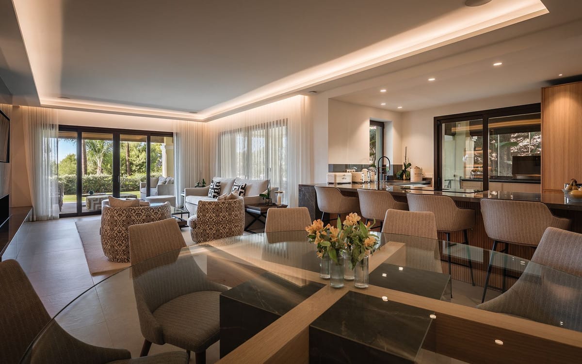 Designed across a single level for utmost comfort, the residence boasts a sophisticated layout. The custom wood-panelled entrance hall opens to a fully equipped open-plan Miele kitchen with an elegant breakfast bar, flowing seamlessly into a spacious living and dining area connected to a wraparound covered terrace and private garden with its own swimming pool. The property also benefits from a second Chef's kitchen featuring top-of-the-line equipment and fully enclosed with glass curtains that can be opened up completely during the warm summer days, converting it to your own fully functional outdoor kitchen.
