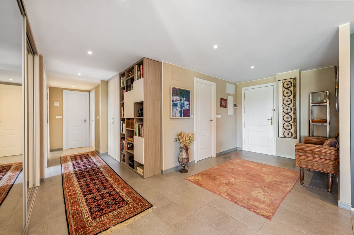 A separate hallway leads to the private sleeping quarters, featuring custom-built storage with mirrored wardrobes and elegant shelving. The master bedroom enjoys an ensuite bathroom, south-facing orientation and direct access to its own large private terrace. Additional bedrooms are well-sized and share beautifully finished bathrooms.