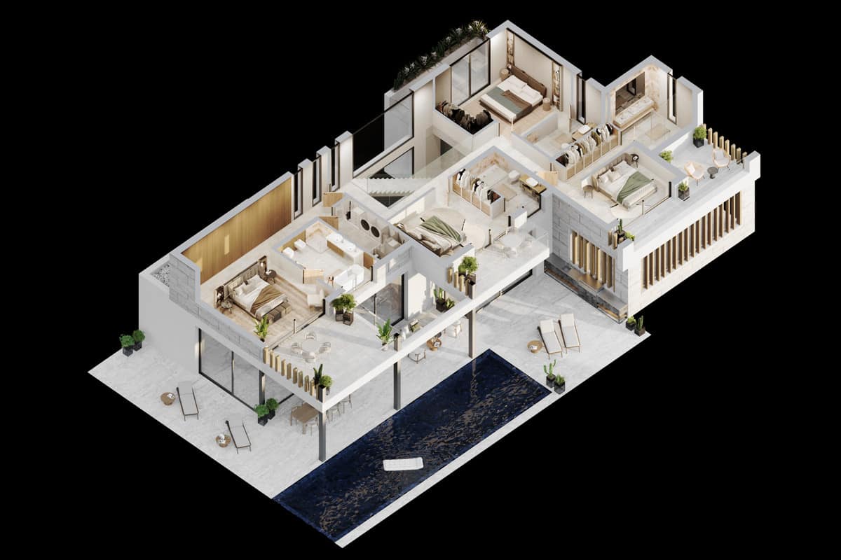 The villa features 4 bedrooms and 4.5 bathrooms, each designed with comfort and privacy in mind. The upper floor hosts the main sleeping quarters, where en-suite bedrooms open onto private terraces, offering peaceful views and a sense of calm that defines the entire home.
