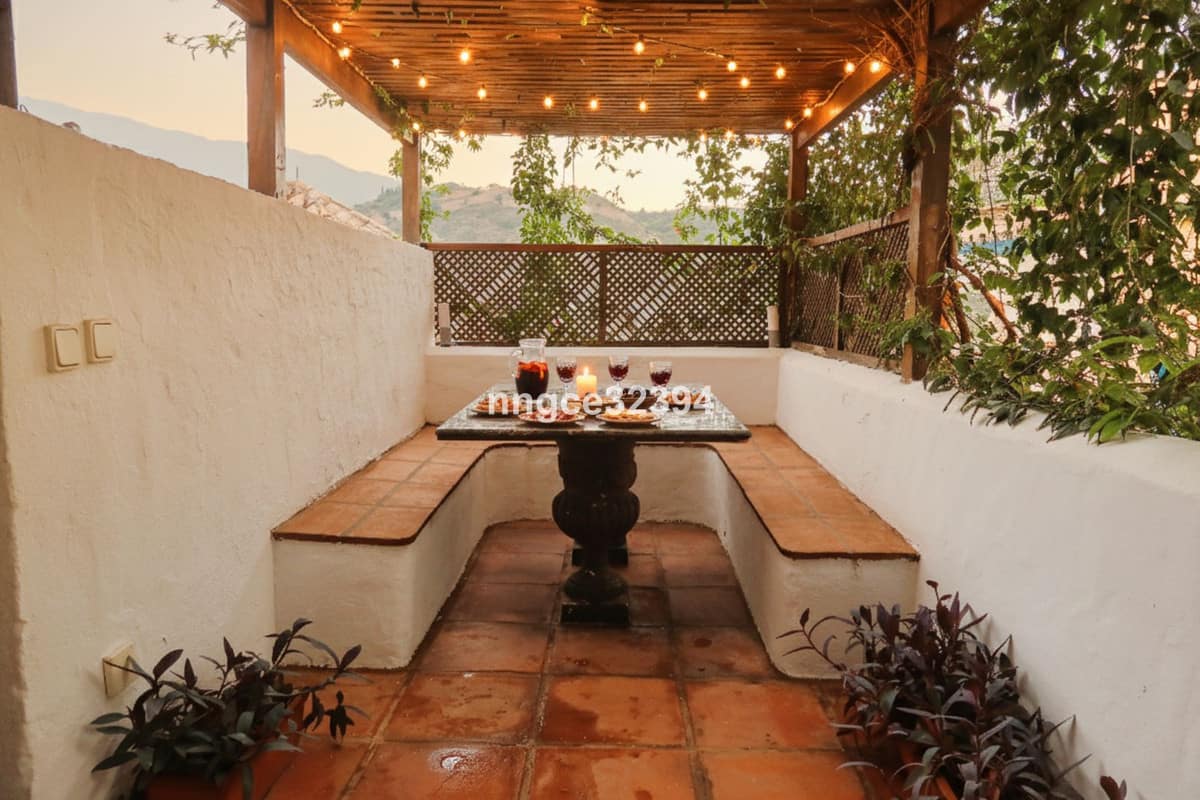 Arranged over multiple levels, the house unfolds with a natural sense of flow and privacy. The main living areas feature traditional terracotta floors, classic proportions, and a welcoming atmosphere that reflects the soul of an authentic Andalusian home. A vine-covered terrace provides an intimate setting for outdoor dining and relaxed evenings, while the rooftop solarium offers open village and mountain views — ideal for sunset drinks or quiet mornings.