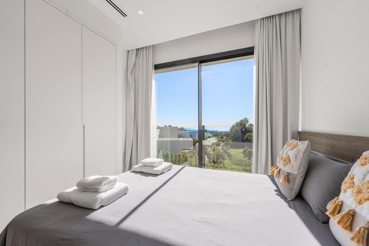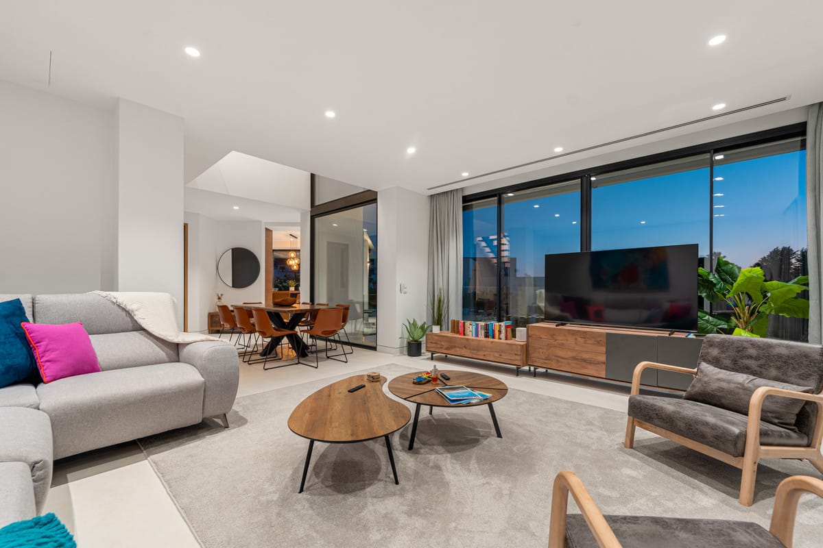 The interior comes fully furnished, showcasing a sleek, fully fitted kitchen, a bright dining room, and an inviting living area. Floor-to-ceiling glass doors flood the home with natural light while framing panoramic vistas of the sea, mountains, golf course, and surrounding greenery. From the roof terrace, enjoy unobstructed views stretching across the coastline — a spectacular setting for entertaining or sunset cocktails.