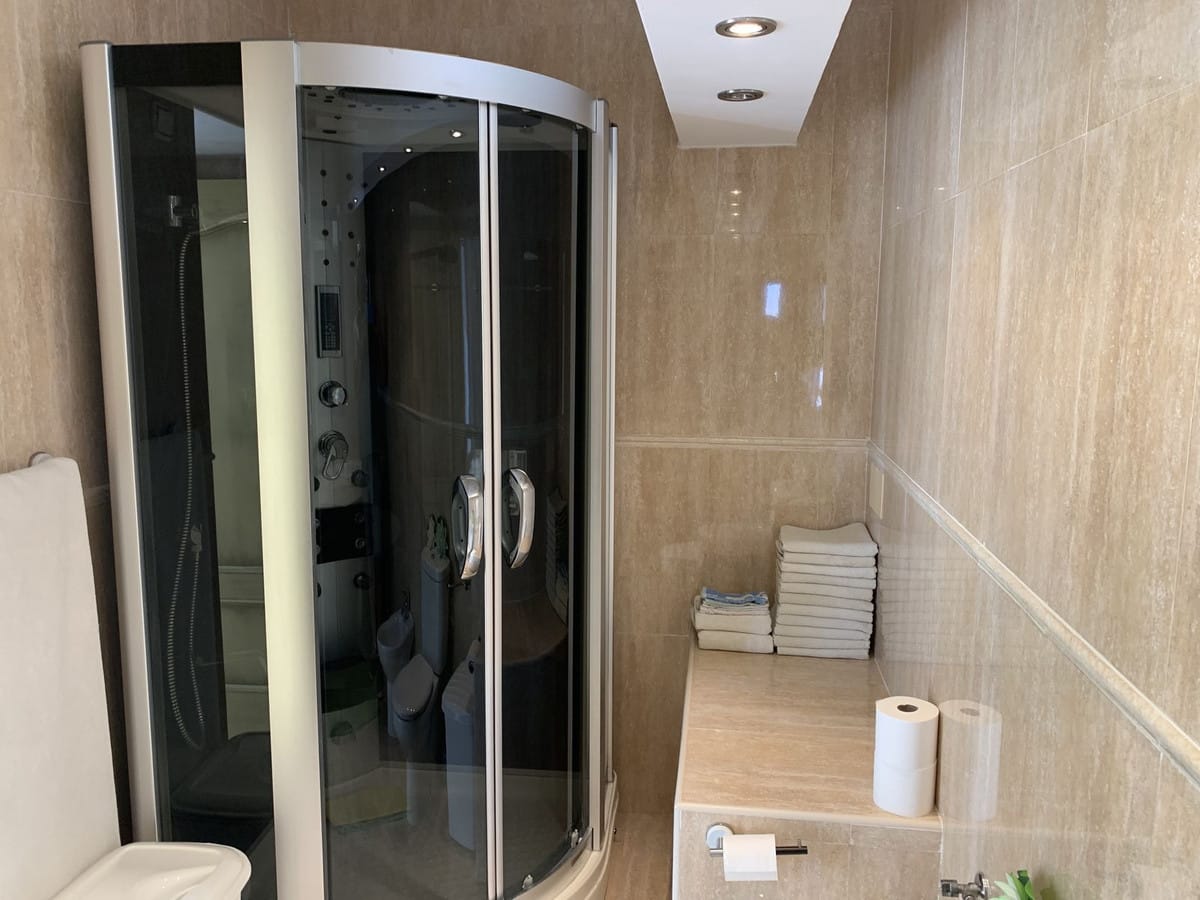 Master bedroom suite. Double in size with one of the original bedrooms converted into a spacious walk in dressing room with ample wardrobes and storage. The master bedroom features an elegant elevated sleeping area with patio doors leading onto a large private balcony. There is a spa bathroom ensuite with double sinks with fitted cupboards underneath. A large spa bath jacuzzi, bidet and toilet with heated towel rail. There is air-conditioning throughout the suite.