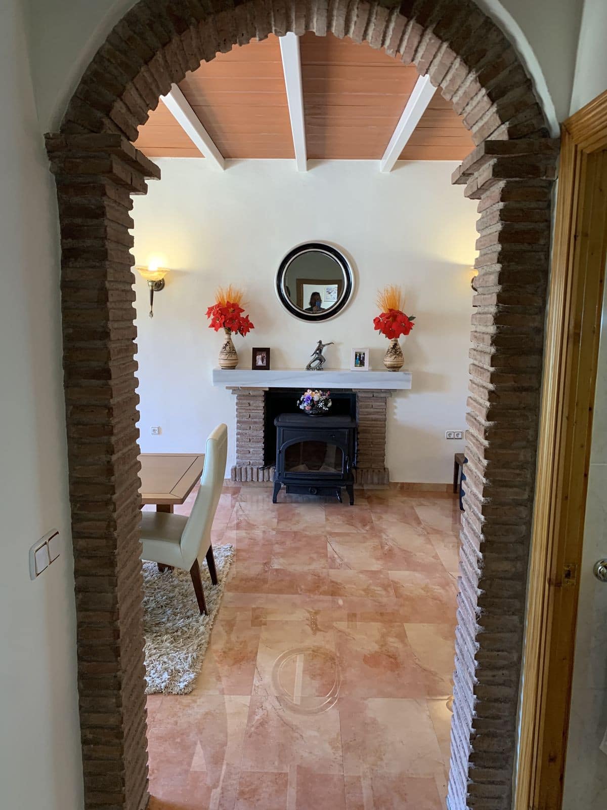 Surrounded by windows and sliding patio doors, flooding the space with natural light. It features a fan-assisted wood burning fire and a hot and cold A/C unit. There are two covered terraces which offer a space for entertaining or relaxation. Also there is a door leading into the kitchen.