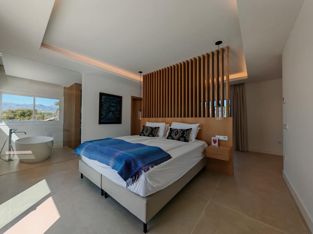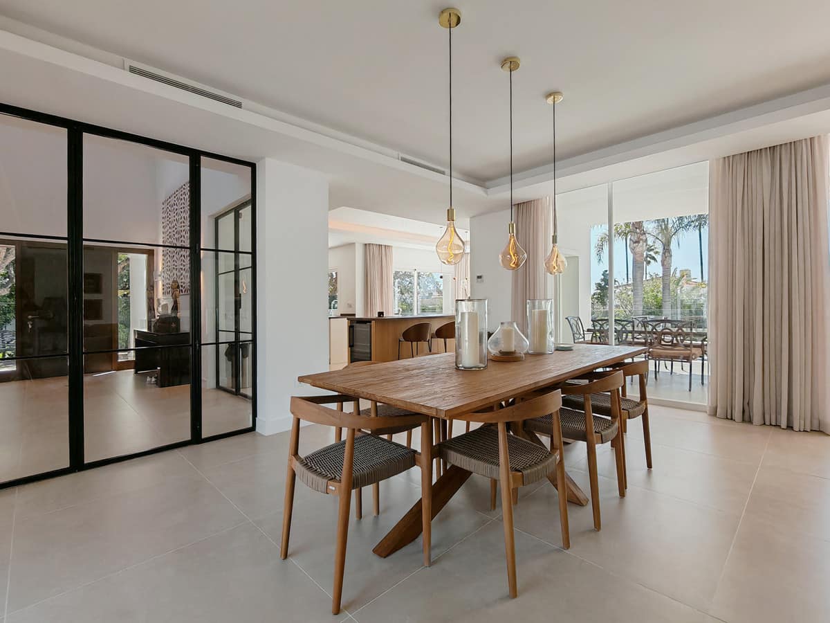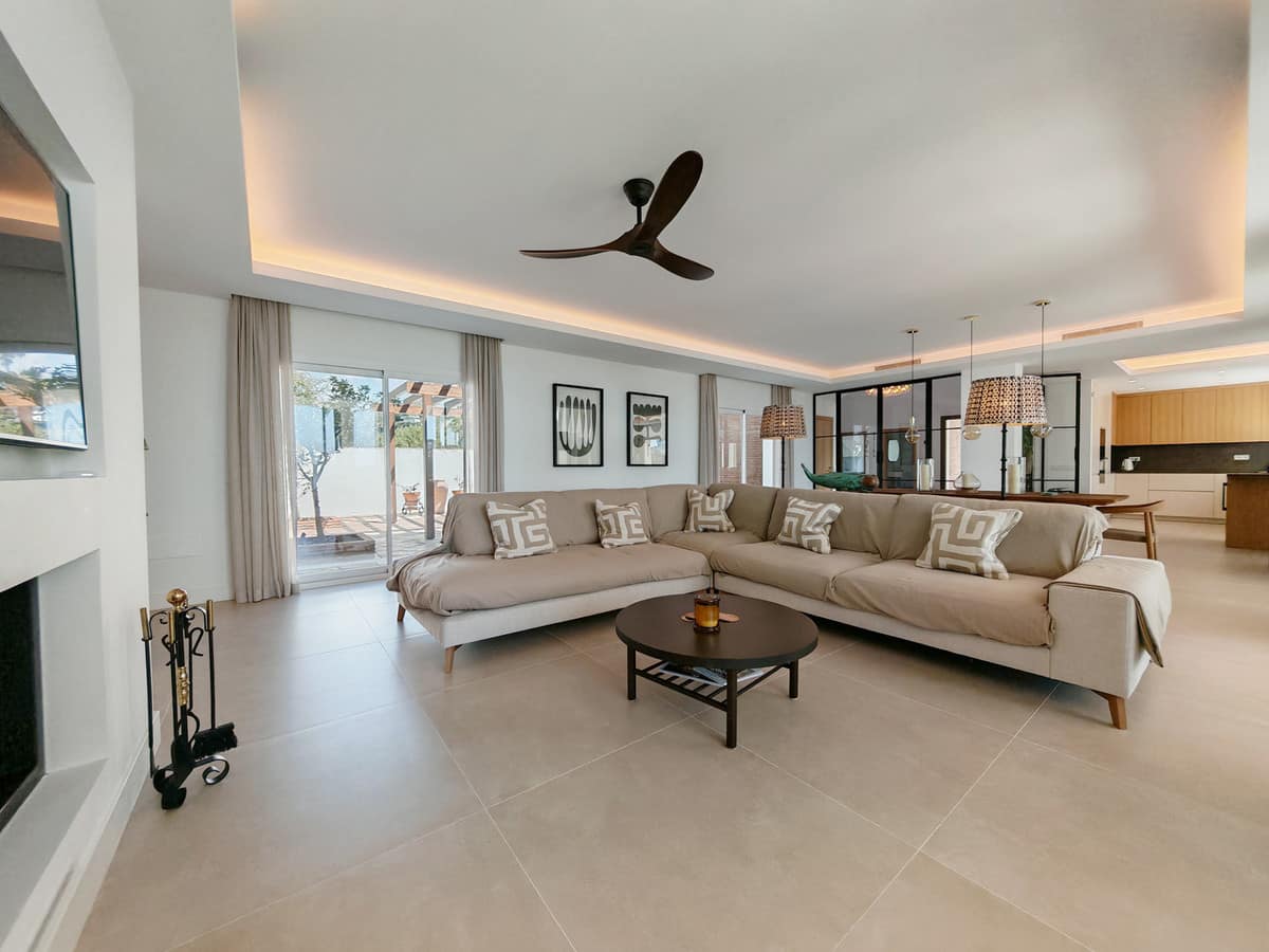 Villa for sale in Elviria, Marbella with 4 bedrooms, 4 bathrooms, 4 en suite bathrooms, 1 toilet and with orientation south, with private swimming pool, private garage and private garden. Regarding property dimensions, it has 327 m² built and 1,519 m² plot. Has the following facilities amenities near, transport near, air conditioning, central heating, fully fitted kitchen, utility room, fireplace, gym, alarm, guest toilet, private terrace, kitchen equipped, country view, mountain view, heated pool, automatic irrigation system, smart home system, laundry room, internet – wi-fi, fitted wardrobes, garden view, close to sea / beach, glass doors, excellent condition, recently renovated / refurbished, close to shops, close to town, close to schools, surveillance cameras, office room and partial sea views.