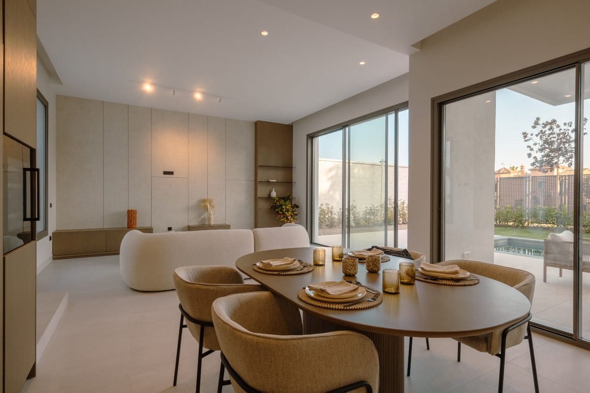 The entrance floor of the villa is comprised of a fully equipped kitchen and a bright and spacious living area, that leads seamlessly to the outdoor dining terrace, private garden and pool area. The outdoor area offers ample space for dining, relaxation and entertainment in a tranquil and private setting.