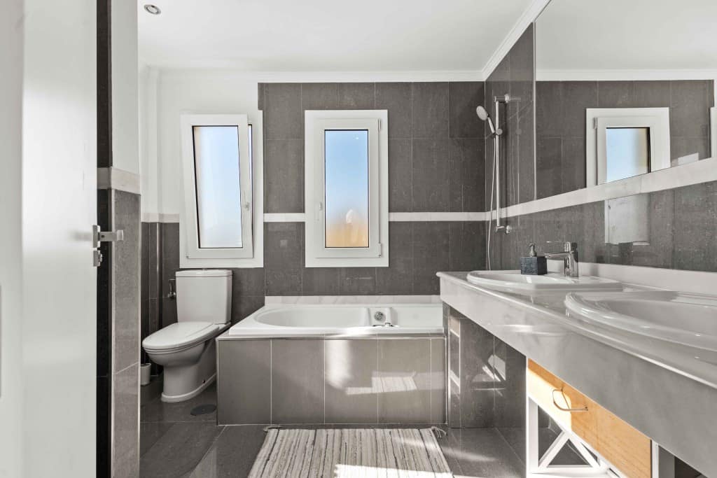 The upper floor features an impressive master suite, as well as two spacious guest bedrooms and an additional bathroom. Each bedroom has its own private terrace to enjoy incredible views of the golf course and mountain range in the background. This floor also leads to a private roof terrace with amazing 360-degree panoramic views of the sea and mountains.