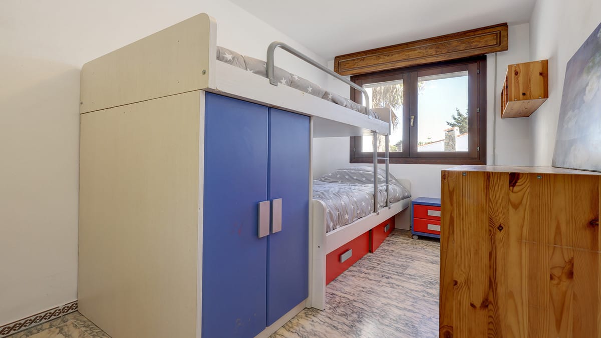 Ascending to the first floor, you'll find three well-proportioned bedrooms, all with fitted wardrobes. The master suite enjoys its own en-suite bathroom and a private balcony with beautiful sea views. The two additional bedrooms—one double and one single—share a bathroom on this level. To make the most of the fresh sea breeze, all bedrooms are fitted with mosquito nets.