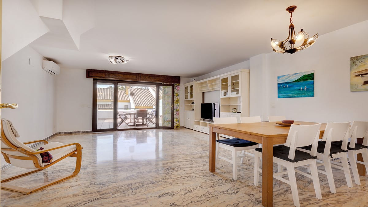 As you enter, the kitchen is positioned to the right, complete with a separate laundry and storage room. To the left, you'll find a guest toilet, followed by a staircase leading to the upper floors. Continuing straight through the hallway, the spacious living and dining area opens onto a generous terrace, which enjoys sunlight all year round. The outdoor space is thoughtfully designed, with a covered section for dining and an open area to bask in the Spanish sun. From here, you can take in glimpses of the sea and beach, adding to the charm of this seaside home.