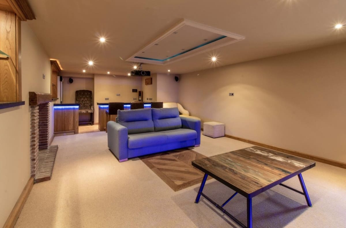 A basement equipped with a bar and a relaxation area completes this elegant interior, ideal for enjoying unforgettable moments with family and friends.