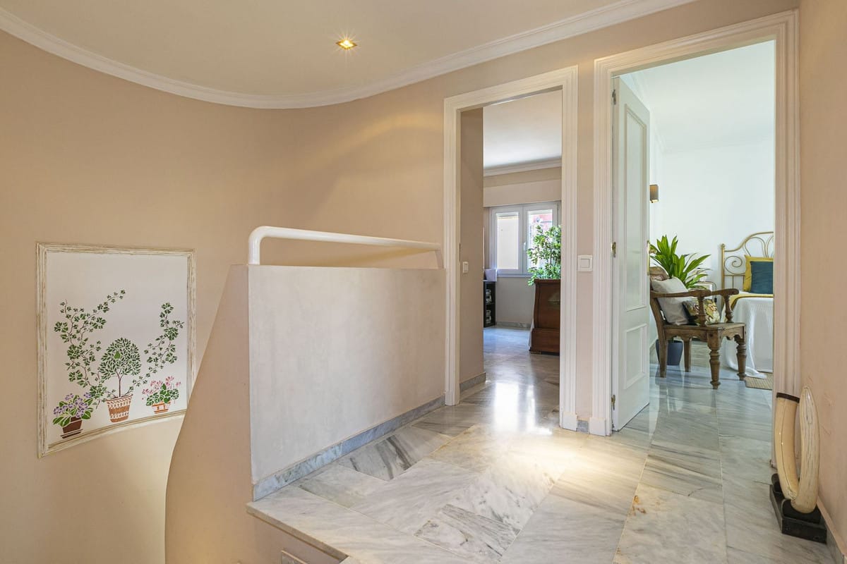 Tucked away in the exclusive beachside area of Los Monteros in Marbella East, just a short walk from the beach, this villa is truly one of a kind. Inspired by Venetian church architecture, it combines timeless European elegance with relaxed coastal living. Set on a generous 933 square metre plot, the four-bedroom, four-bathroom home—including two en-suites—is spread across three levels, offering a unique blend of style, comfort, and space. A grand entrance welcomes you with elegant pillars, arched doorways, and polished marble floors that run throughout the house, setting the tone for what’s to come.