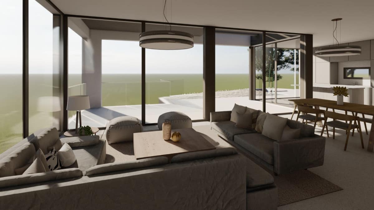 Inside, the house is spacious and open, with high ceilings and clean lines.